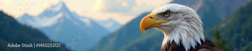 Majestic eagle head, sharp focus, mountain backdrop, highland, mountain range, avian
