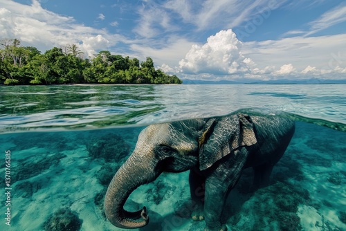 Majestic elephant swimming in a clear tropical lagoon surrounded by lush greenery