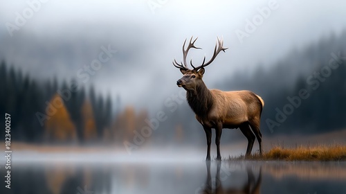 Majestic Elk Standing Tall by Misty Lake with Forest Backdrop, Creating a Serene Wildlife Scene