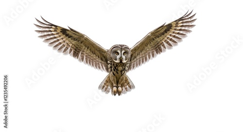 Majestic Great Grey Owl in Flight Wings Spread Wide Isolated on White Background