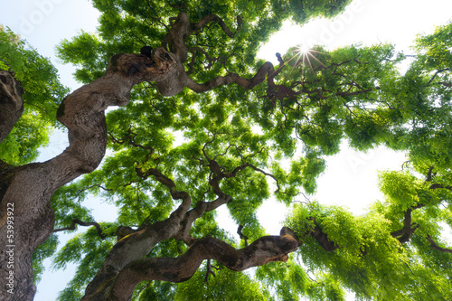 Majestic, green crown of tall, large elm tree with gnarled, twis