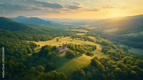 Majestic medieval castle atop distant mountain overlooks verdant countryside, with lush hills, golden sunlight, and wispy clouds in panoramic fairy tale landscape under vibrant blue sky.