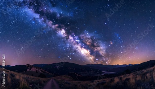 Majestic Milky Way arches over dark, rolling hills with a serene valley in the distance. Breathtaking night panorama