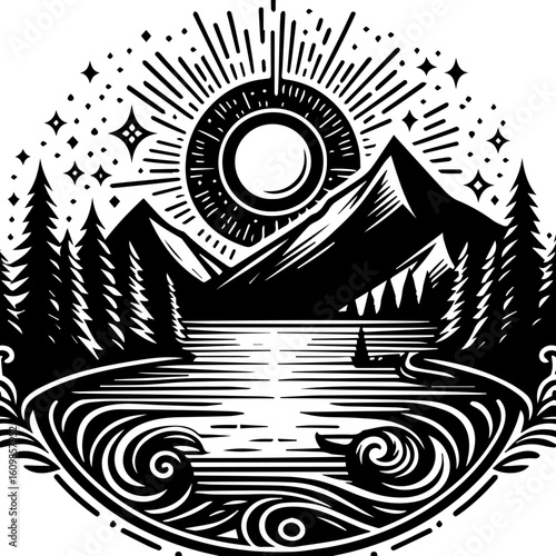 Majestic Mountain Lake Sunrise with Pine Trees.