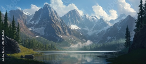 Majestic mountain landscape with serene lake and lush green forest in a tranquil national park setting under a sunny sky