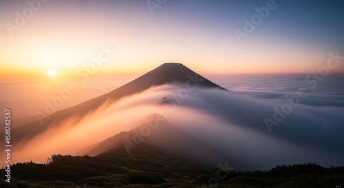 Majestic Mountain Peak Emerging from Cloudscape at Sunrise A Scenic Alpine Vista