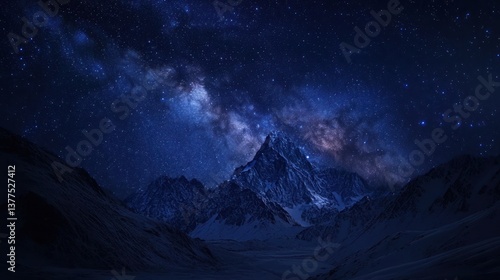 Majestic mountain peak under a vast night sky filled with stars and the Milky Way. Snowy mountain range in the dark. Ideal for travel posters, perfect for nature and astronomy enthusiasts.