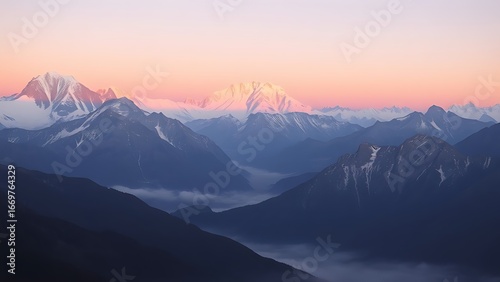 Majestic mountain range at sunrise with soft pink and orange hues over snowy peaks and misty valleys.