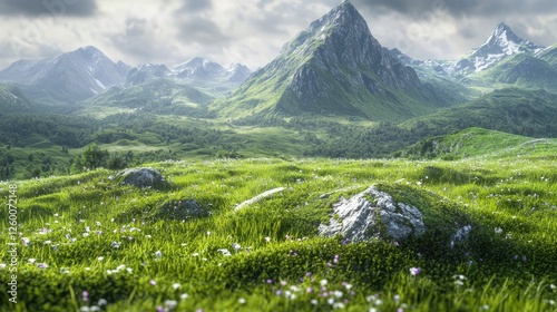 Majestic mountain range, lush meadow, scenic view, summer landscape, travel photography