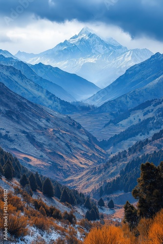 Majestic mountain range under a dramatic sky with vibrant autumn colors