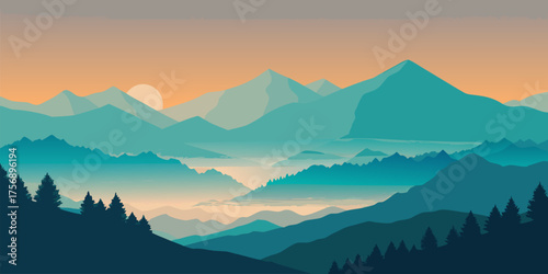 Majestic mountain range with a misty valley at sunrise