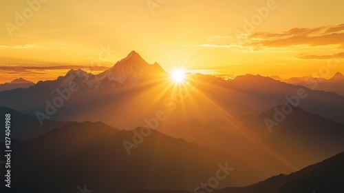 Majestic Mountain Sunrise Over Scenic Landscape with Golden Rays