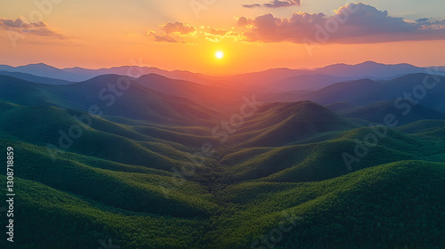 Majestic Mountain Sunset: The sun dips below the horizon, painting the sky with vibrant hues as it casts a warm glow over rolling hills. Capture the awe-inspiring beauty of nature.