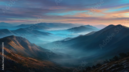 Majestic Mountain Vista: A breathtaking panorama unfolds, revealing a series of imposing mountain ranges shrouded in ethereal mist, painted by the gentle hues of dawn.