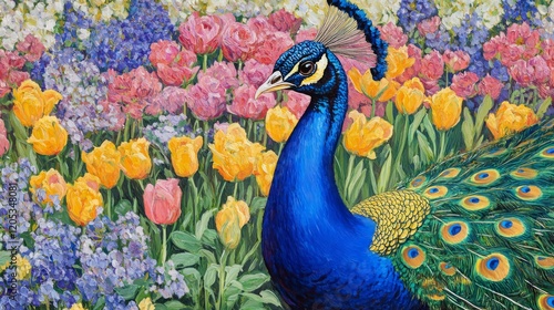 Majestic Peacock Amidst Vibrant Spring Tulips