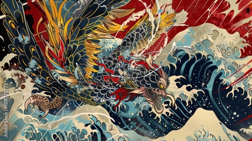 Majestic Phoenix Soaring Through Turbulent Waves: A Stunning Piece of Japanese Art