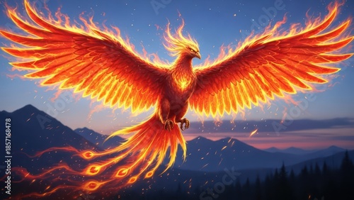 Majestic phoenix soars above the mountain range casting a fiery glow across the sky