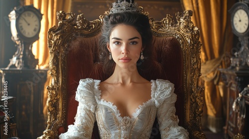 Majestic queen, ornate throne, regal attire.