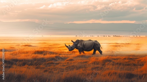 Majestic Rhino Walking Across Golden Savannah at Sunset, Symbolizing Endangered Species Hope