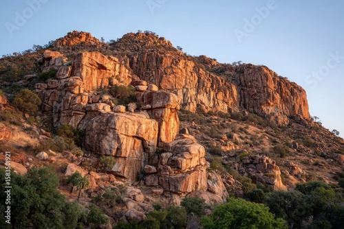Majestic rocky mountain landscape at sunset with warm hues illuminating the rugged terrain