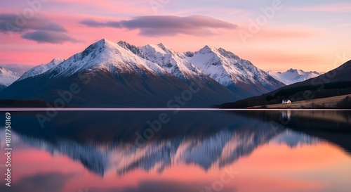 Majestic snow capped mountains reflecting in calm lake waters at sunset with vibrant pink and orange sky creating serene landscape