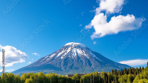 Majestic snow capped volcano under clear blue sky with fluffy clouds