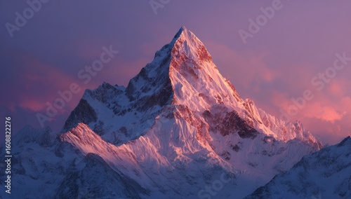 Majestic snow-capped mountain peak bathed in vibrant sunset colors