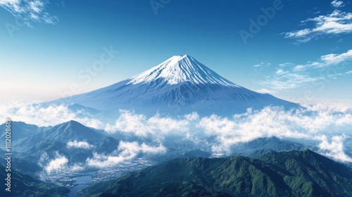 Majestic snow-capped mountain peak rising above clouds under a clear blue sky.