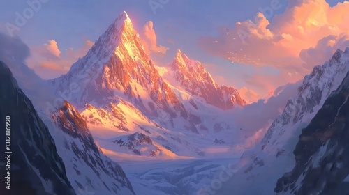 Majestic snow-capped mountain peaks at sunset.