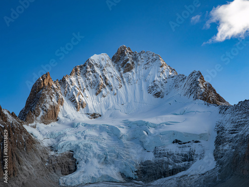 Majestic snow-capped mountain peaks pierce a brilliant blue sky with a single fluffy cloud drifting by, showcasing nature's raw beauty and serene grandeur.