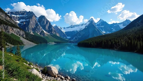 Majestic snow-capped peaks of the Alberta Rockies rise above a pristine alpine lake reflecting the vibrant blue sky A breathtaking panorama of untouched wilderness , sky, alberta