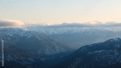 Majestic Snow-Covered Mountain Range Dawn Twilight Layered Peaks - Epic Alpine Wilderness Landscape