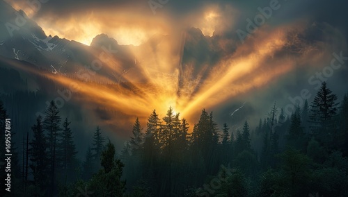 Majestic sunrise illuminating a misty forest landscape with dramatic mountain backdrop