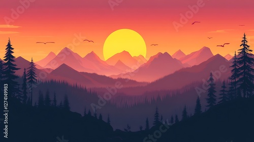 Majestic Sunset Over Silhouetted Mountain Range And Forest