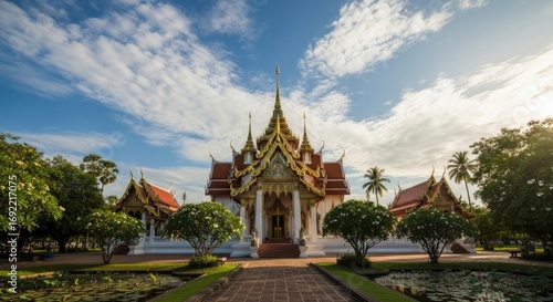 Majestic Thai temple with golden spires and intricate architecture, set amidst lush gardens and a serene pond under a beautiful sky, showcasing traditional Buddhist heritage.