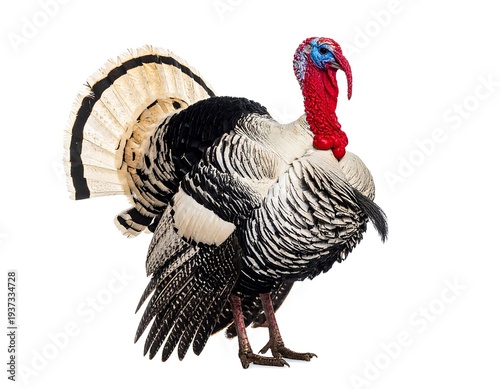 Majestic turkey with vibrant red wattle and ornate tail feathers, isolated on a white background
