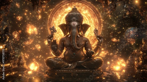 Majestic virtual Ganesha, surrounded by golden glowing lights and virtual gemstones, in a luxurious digital world.
