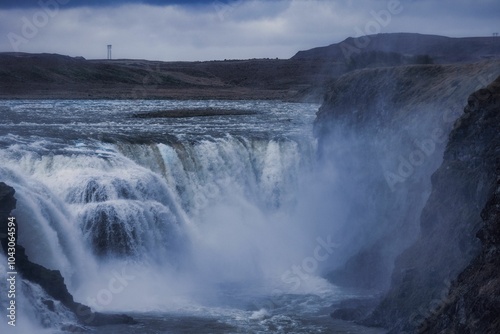 Majestic waterfall under a moody sky.
