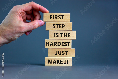 Make first step symbol. Wooden blocks with words First step is the hardest just make it. Beautiful grey table grey background. Businessman hand. Business and make first step concept. Copy space.
