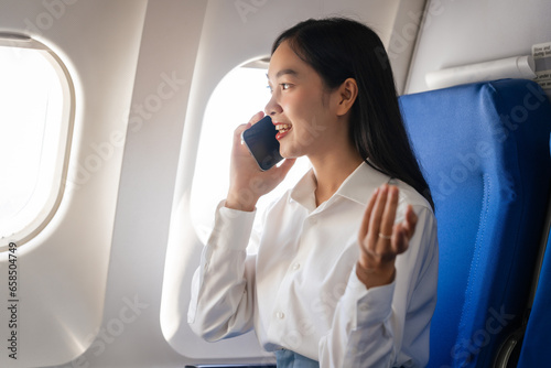 Make phone call on mobile, Thoughtful asian people female person onboard, airplane window, perfectly capture the anticipation and excitement of holiday travel. chinese, japanese people.
