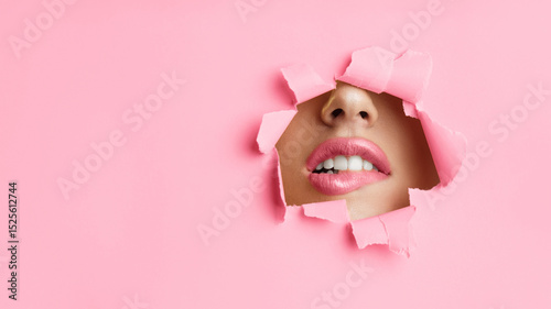 Makeup Concept. Woman Biting Lips Through Hole In Pink Paper, Free Space