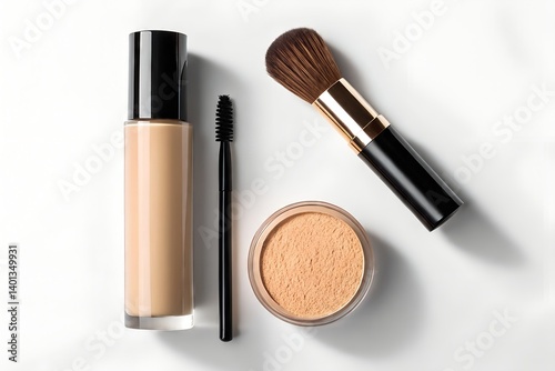 Makeup Set Featuring Foundation Powder Brush And Mascara Wand For Flawless Complexion On A Clean White Background, makeup, foundation, powder, brush, mascara, wand, cosmetic, beauty, product
