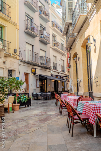 malaga old town architecture details during day hour, empty restaurant tables with no people