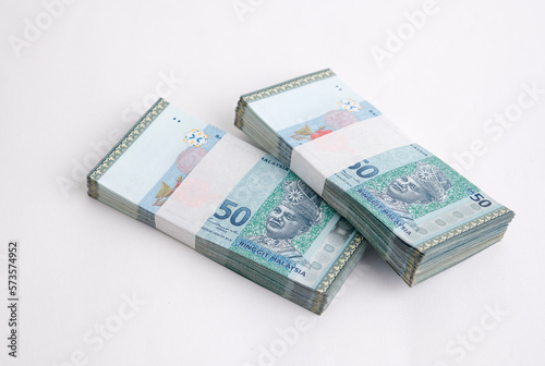 Malaysia Currency Ringgit 50: Stack of Ringgit Malaysia bank note on white background