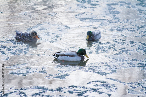 Male and female mallard ducks swimming in the river on a frosty winter morning; ducks floating on a river on a cold winter day
