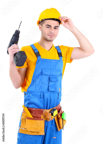 Male builder in yellow helmet isolated on white