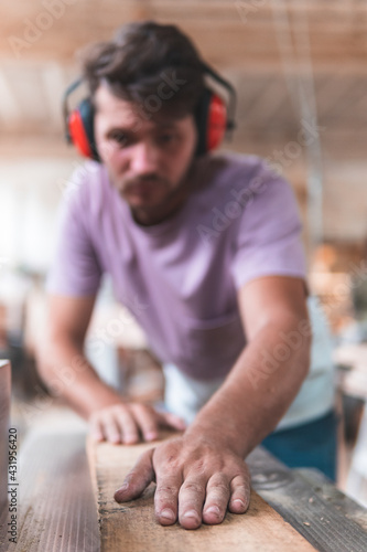 Male carpenter holding wooden plank in workshop