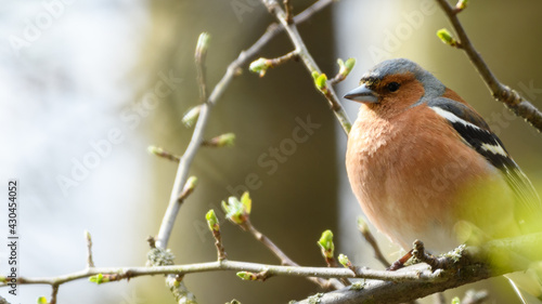 Male Chaffinch (Fringilla coelebs) sitting on the tree branch with blurred background