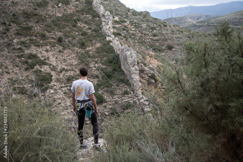 Male climber looking thoughtful to the horizon in a beautiful mountain landscape.