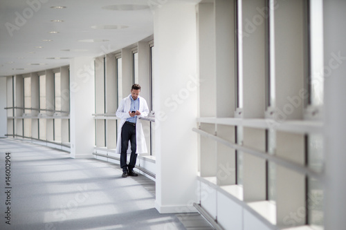 Male doctor using smartphone in hospital corridor